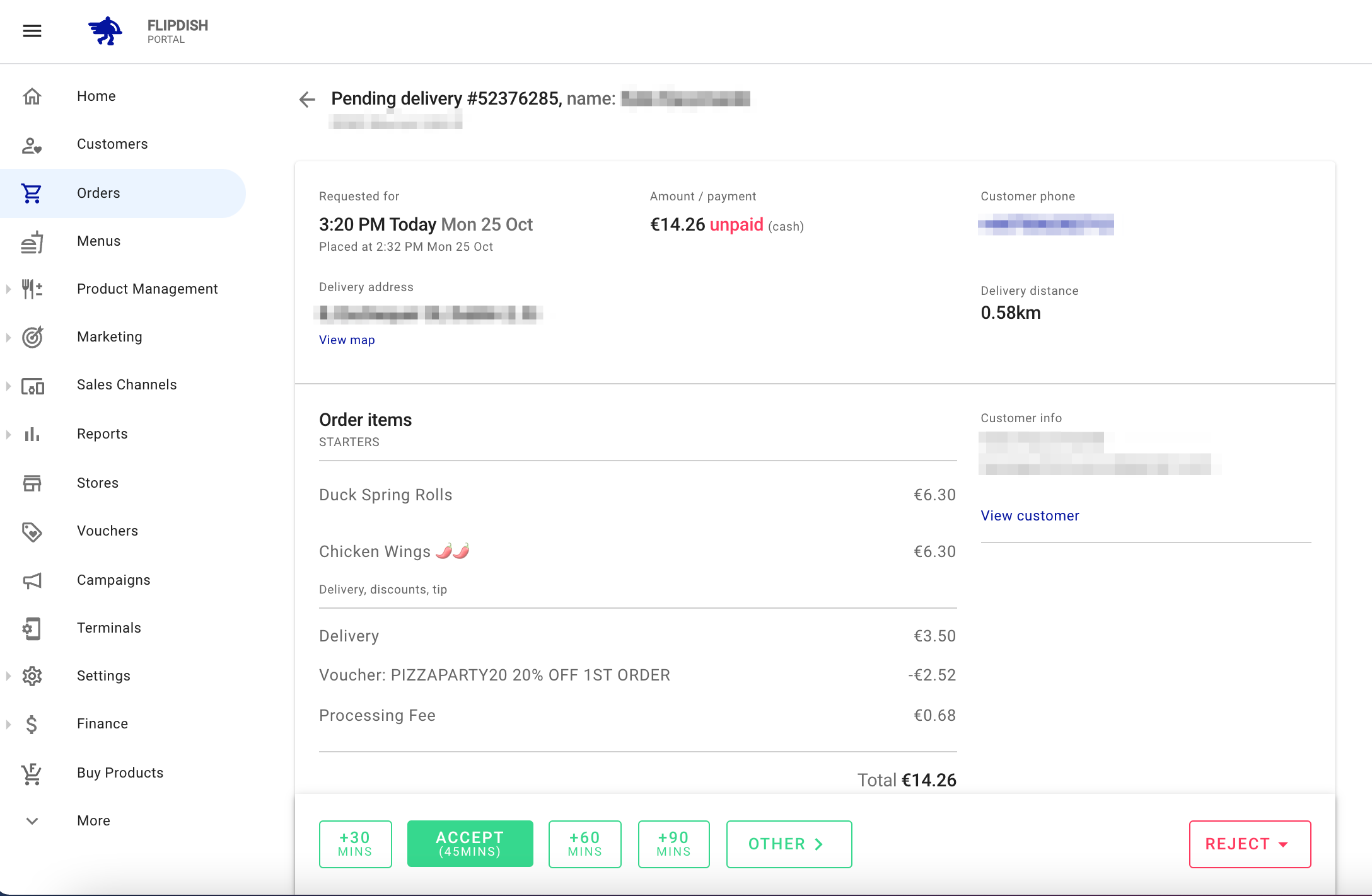 Flipdish is an online ordering system and delivery platform that allows restaurants to create their own mobile app and website for online ordering. This online ordering system comes with features such as real-time report generation, customer database management, and integrated payment processing.