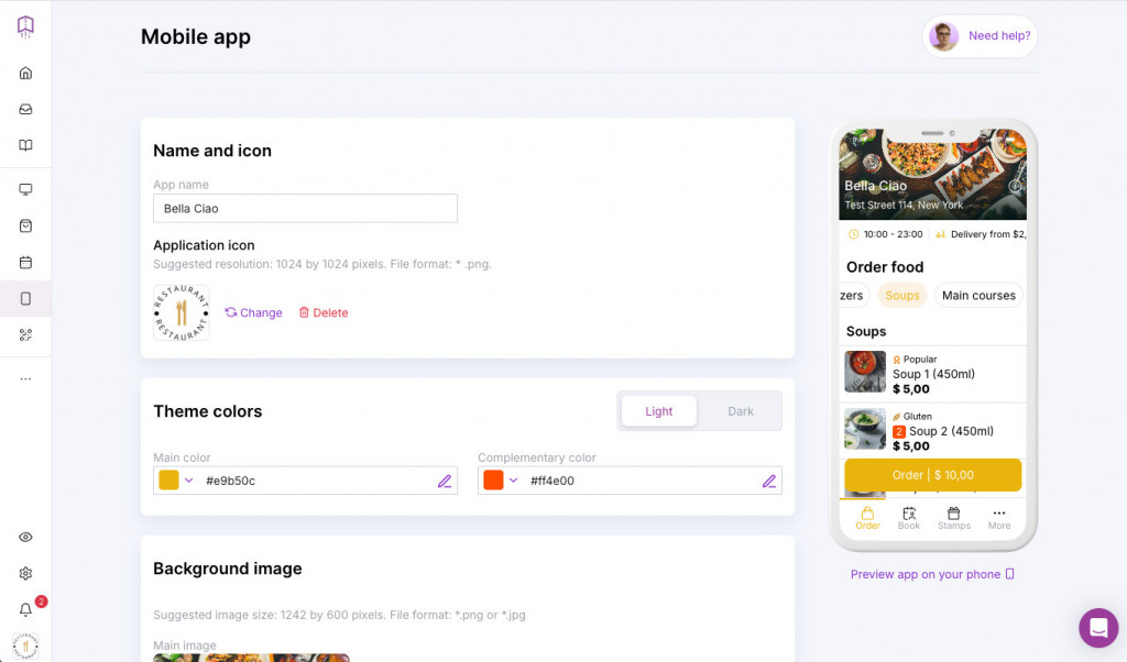 - Choose your app name, upload your restaurant logo, and select brand colors.