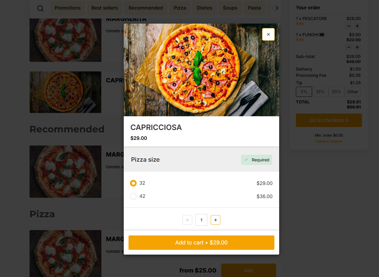 To appeal to pizza lovers, enable a “half-order” feature that allows you to sell your products in half portions. This option is handy for pizzerias, allowing customers to select two halves of a pizza.