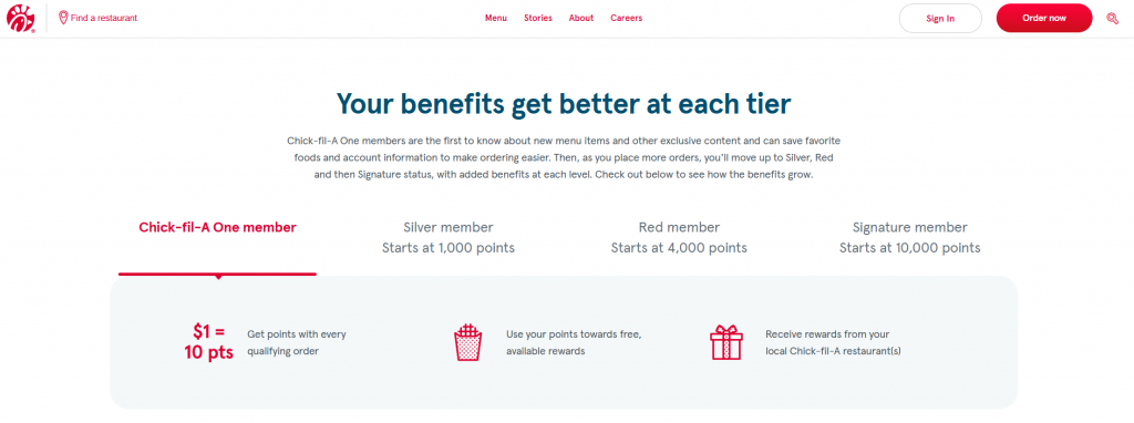 This rewards program has tiered membership levels—Chick-fil-A One, Silver, Red, and Signature—each offering increasing benefits such as more points per dollar spent, the ability to gift rewards, and exclusive experiences like Chick-fil-A Backstage Tours.