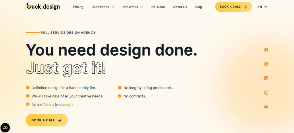 Duck Design is a full-service design agency that offers unlimited design services for a flat monthly fee, eliminating the need for lengthy hiring processes and contracts.