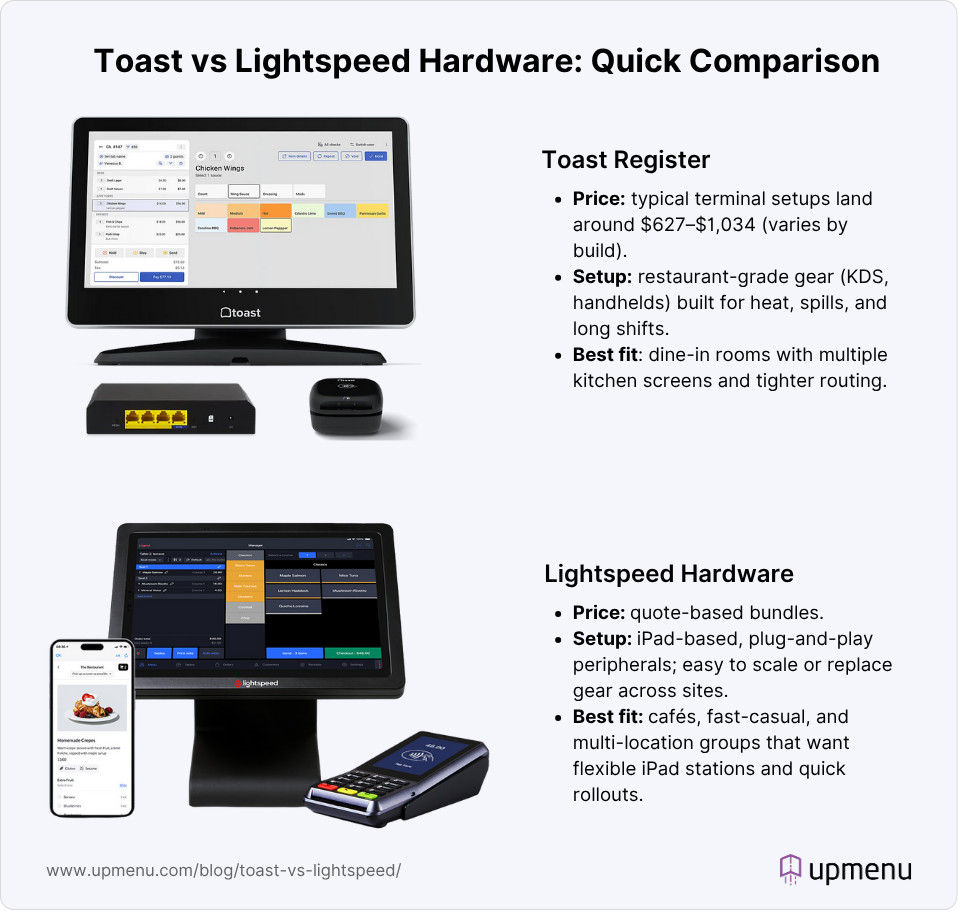 Toast leans on rugged, purpose-built gear, while Lightspeed POS relies on iPads—lighter, easier to scale, and friendlier to budgets.