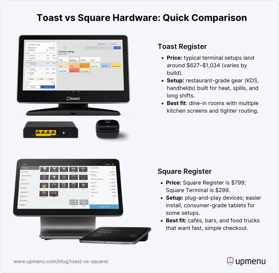 | Hardware Options | Proprietary POS/KDS/handhelds designed for kitchens. | Plug-and-play Square hardware like register and terminal. |