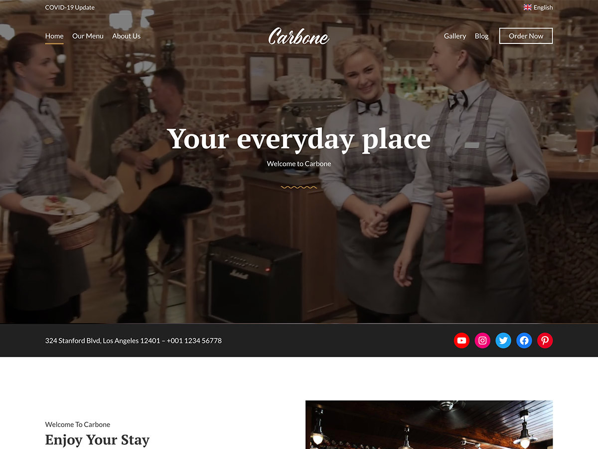 Carbone is a sleek and modern WordPress theme designed by CSSIgniter for restaurants, cafes, and food-related businesses.