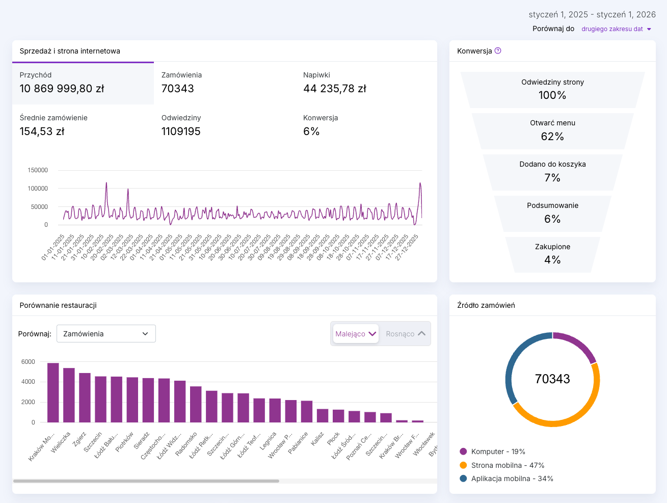 Wszystkie lokale są zarządzane z jednego panelu, co umożliwia kontrolę zamówień, raportów i kampanii marketingowych dla całej sieci z jednego miejsca.